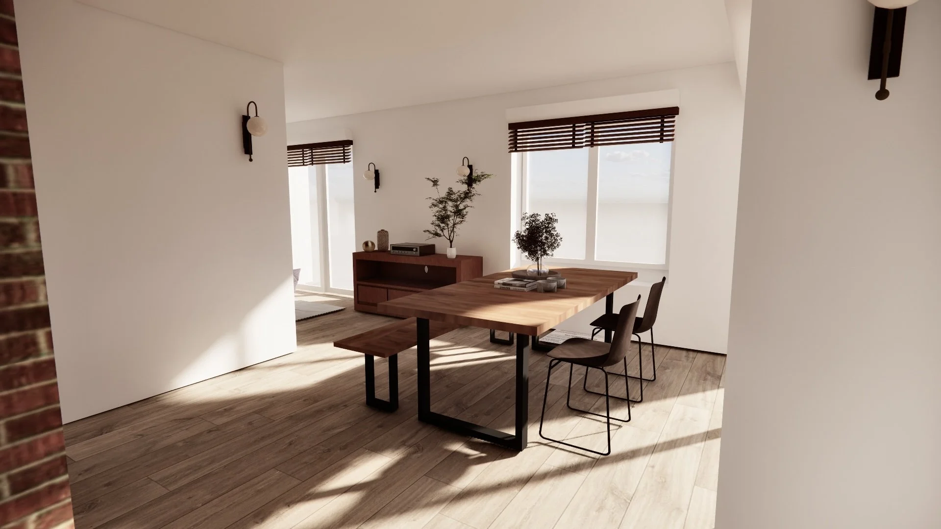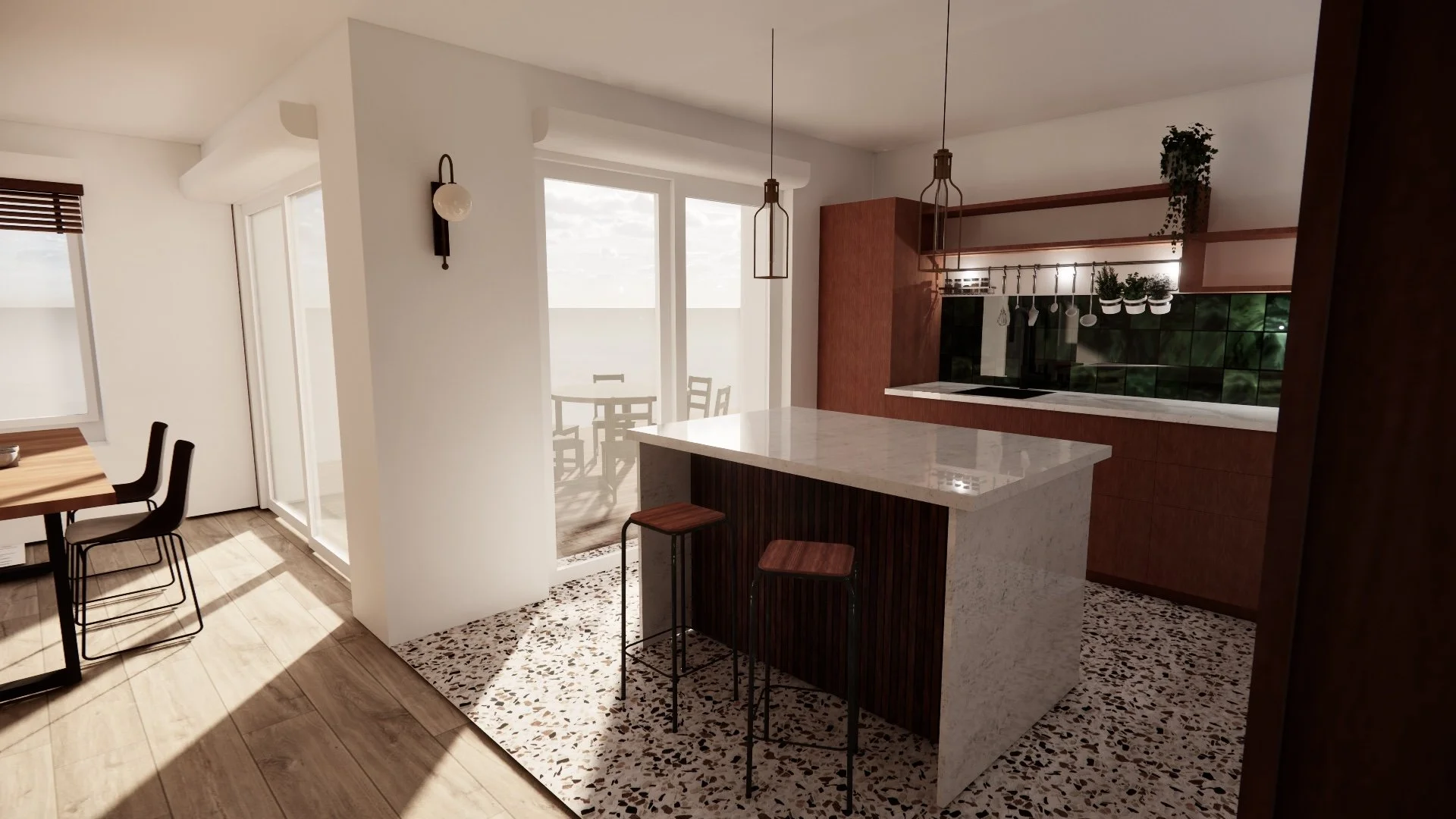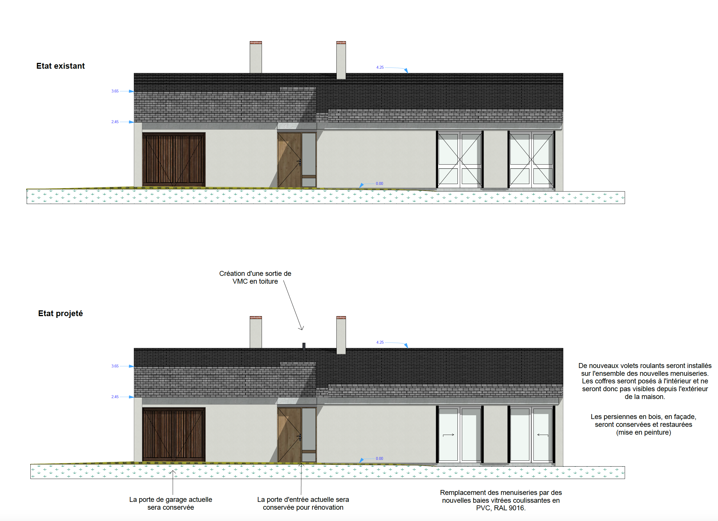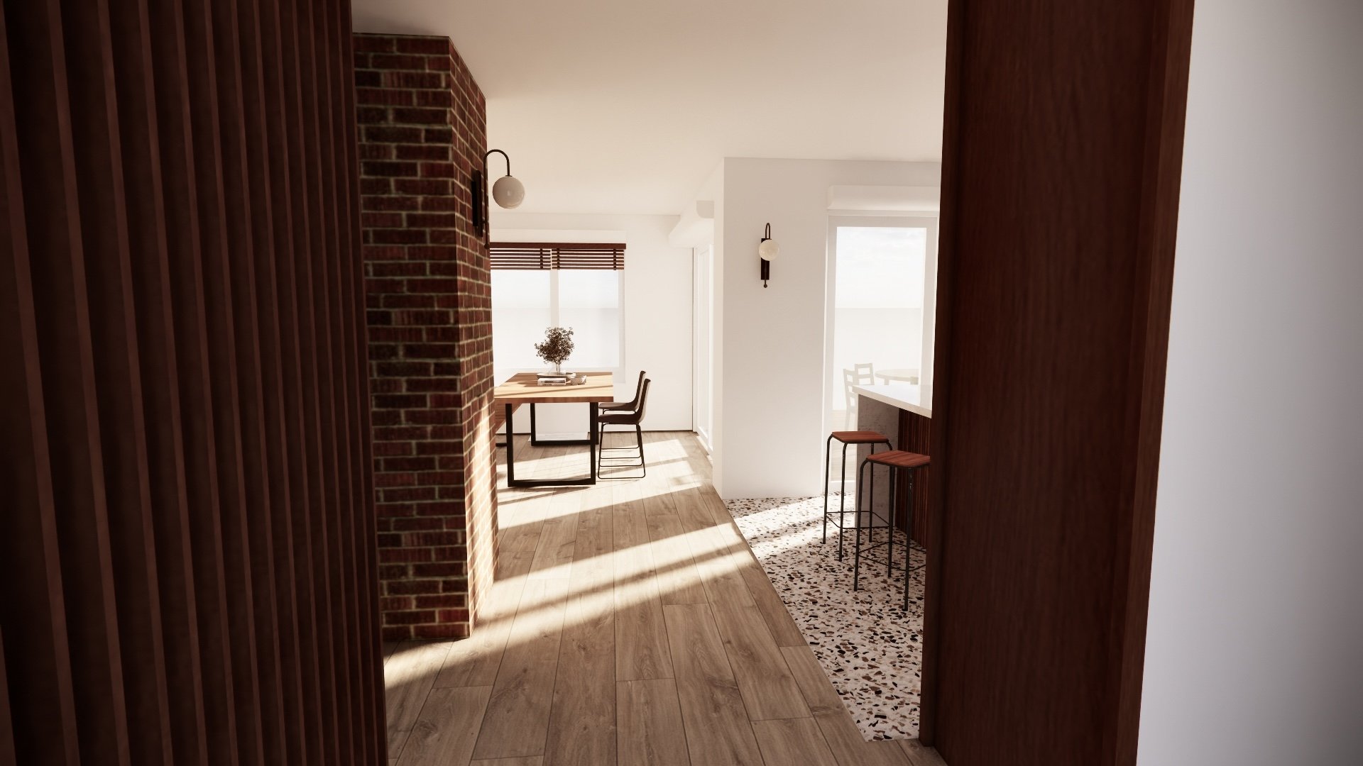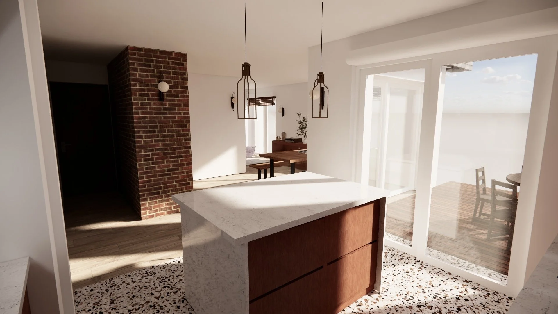 Un travail spécifique est également mené sur les espaces extérieurs, et notamment sur la terrasse, afin de renforcer la relation entre intérieur et extérieur. L’intégration de larges baies vitrées coulissantes permettra de créer un véritable effet dedans/dehors, prolongeant les espaces de vie vers le jardin et la lumière.
