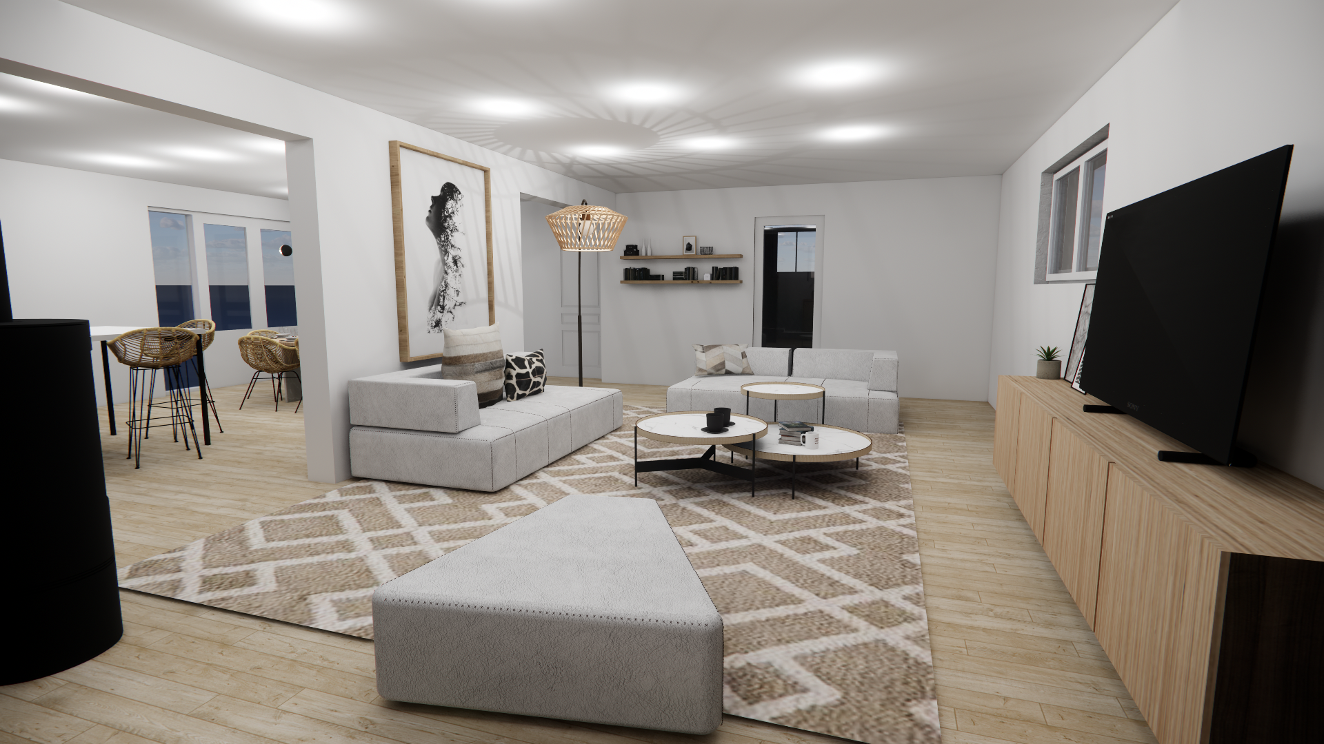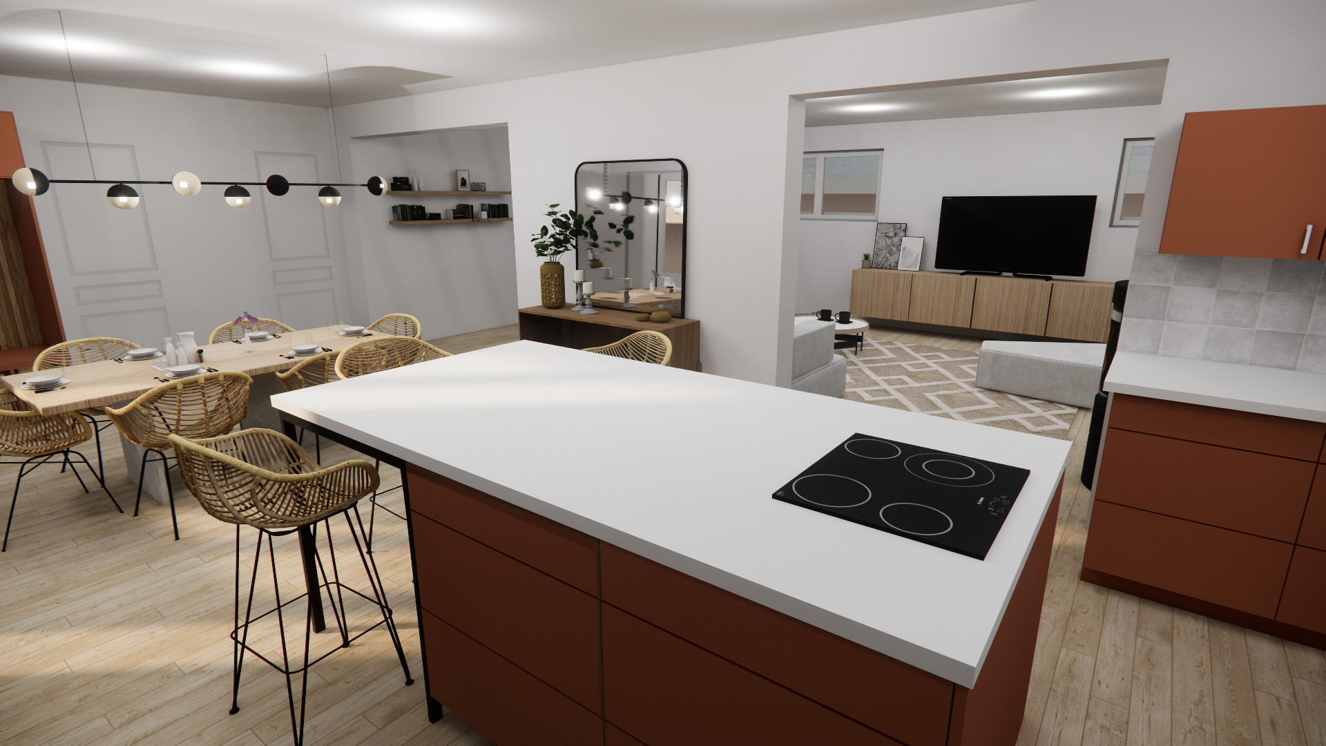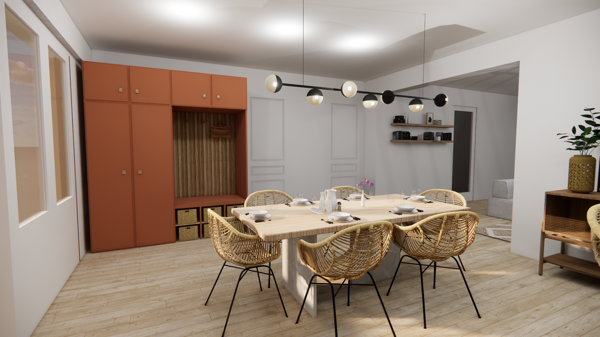 L’enjeu a été de conserver un espace chaleureux malgré une faible luminosité présente au rez-de-chaussée (maison semi-enterrée). Nous avons donc proposé un plateau salle à manger/séjour/cuisine ouvert afin de renforcer cette impression d’espace.