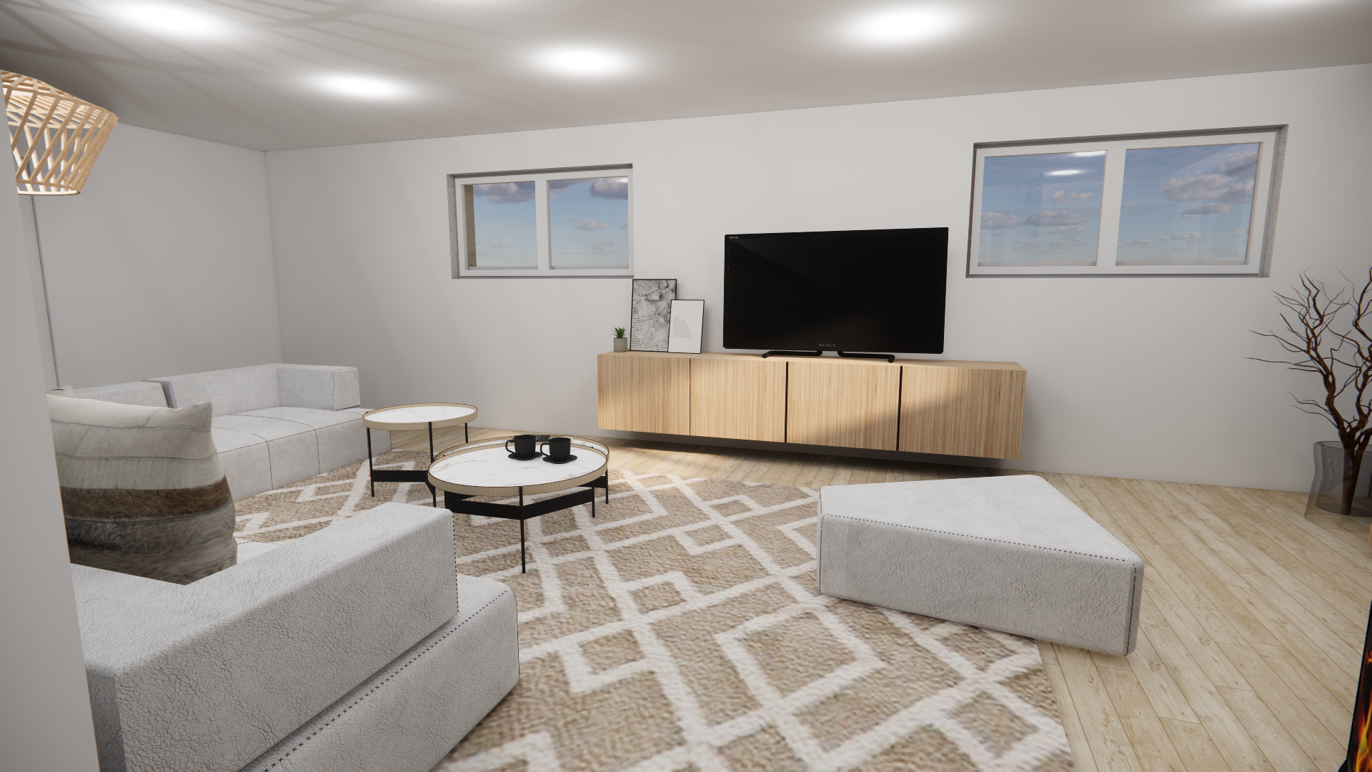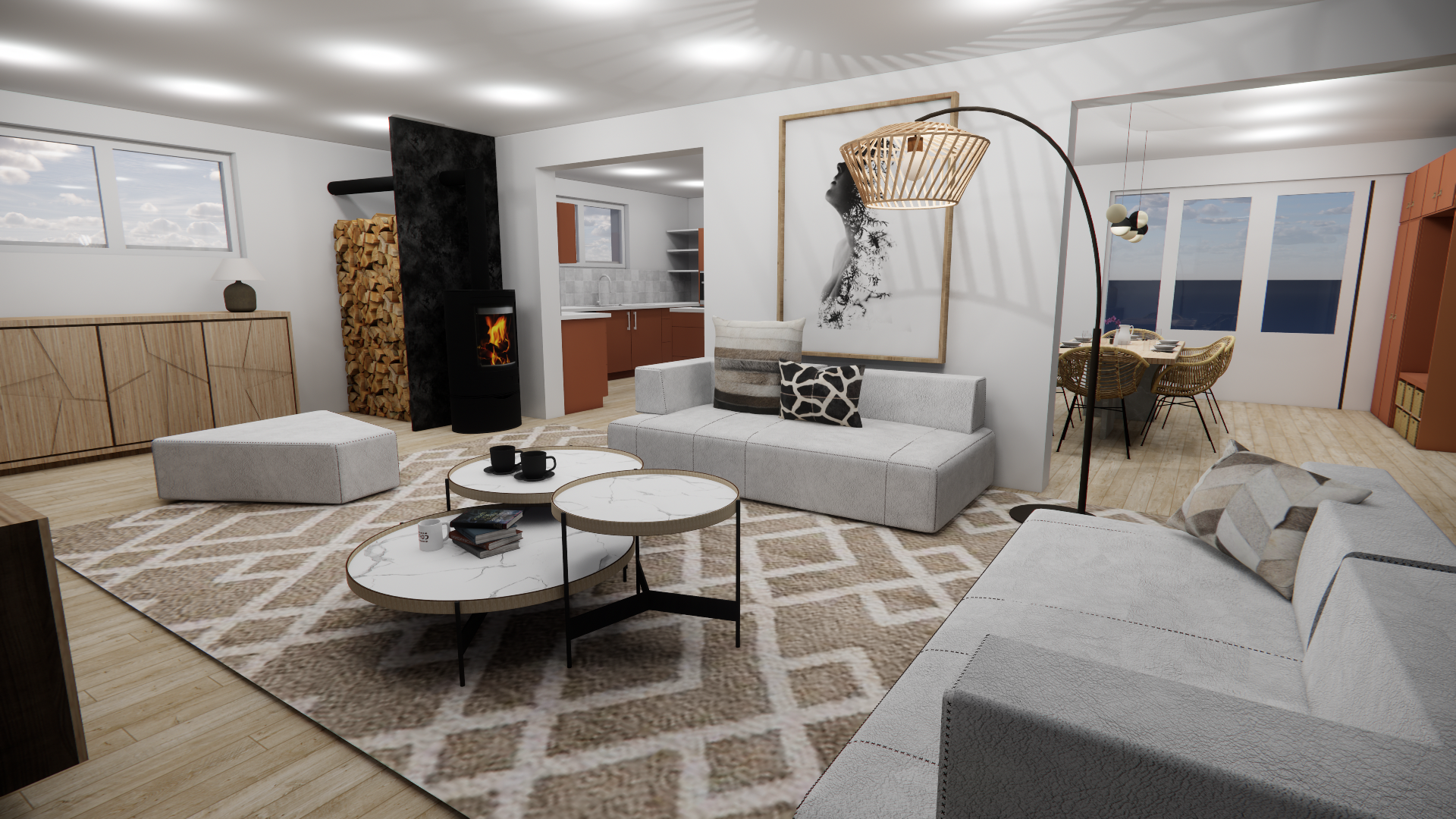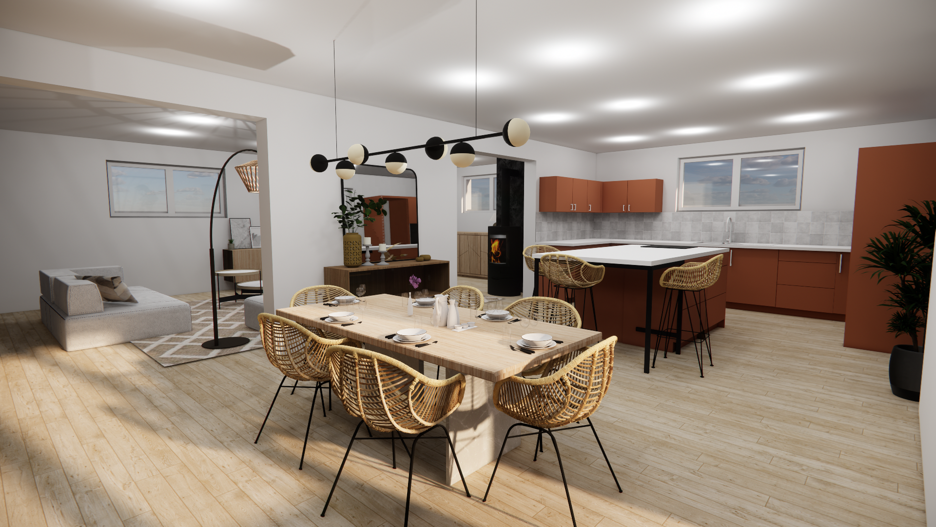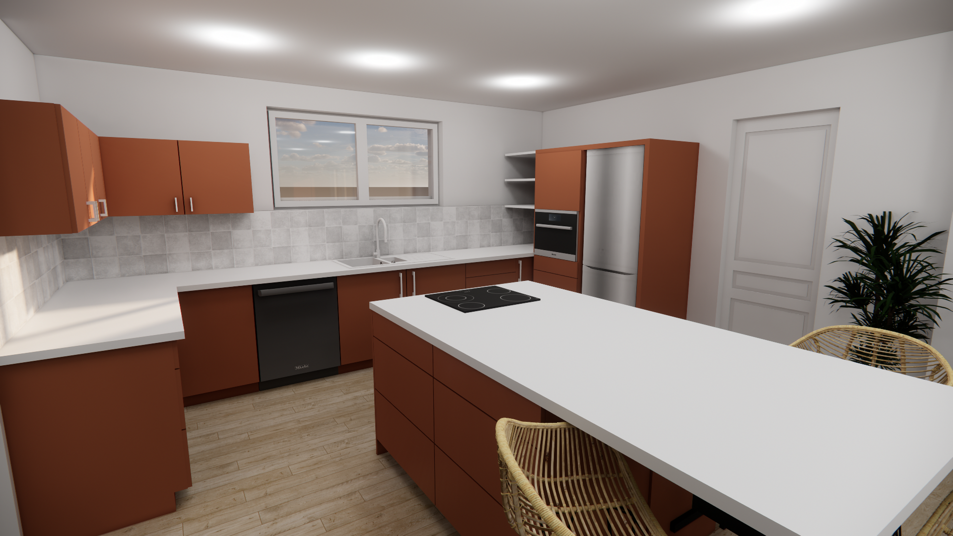L’enjeu a été de conserver un espace chaleureux malgré une faible luminosité présente au rez-de-chaussée (maison semi-enterrée). Nous avons donc proposé un plateau salle à manger/séjour/cuisine ouvert afin de renforcer cette impression d’espace.