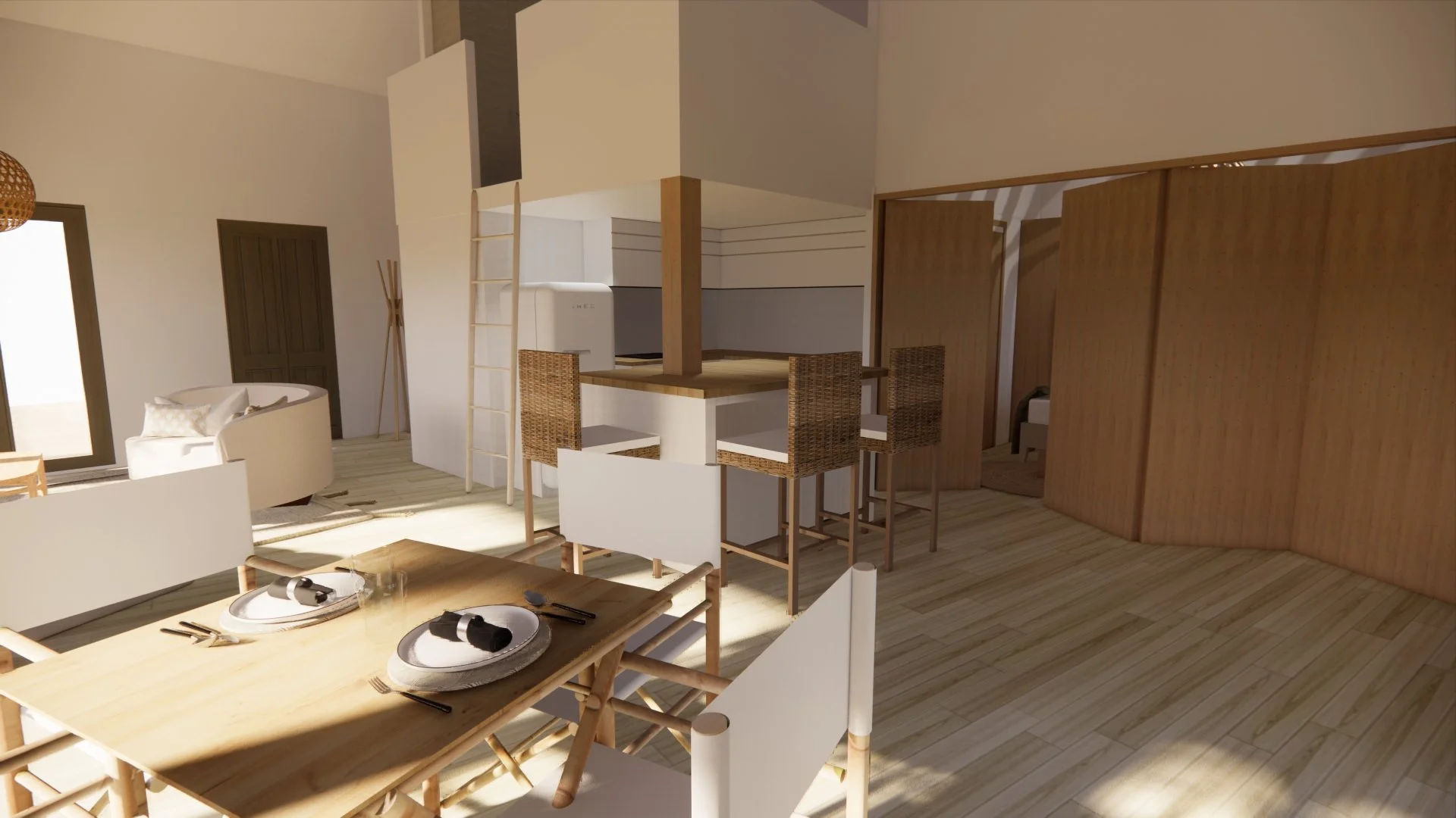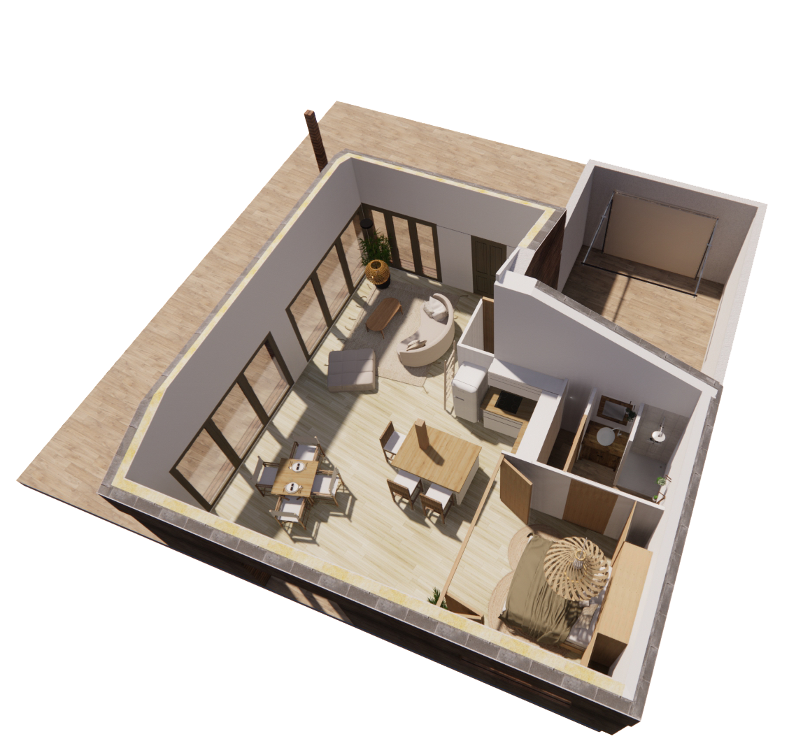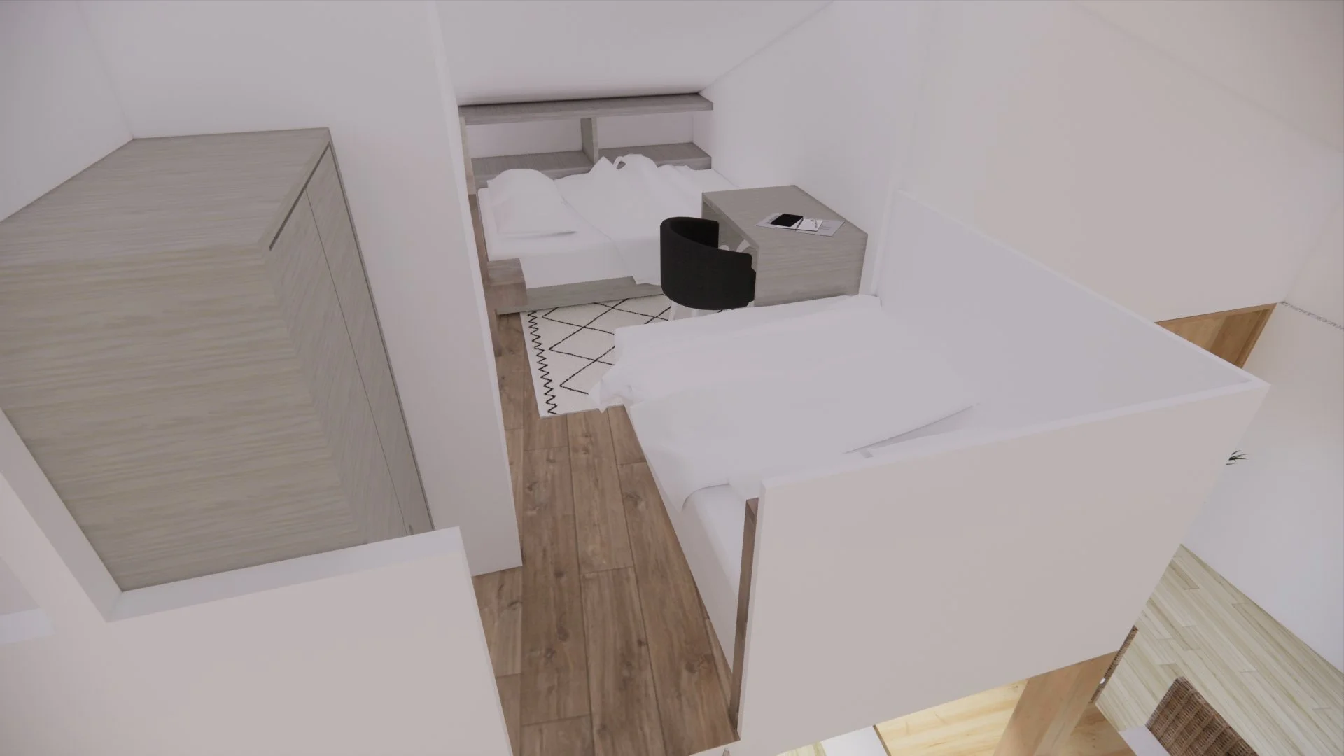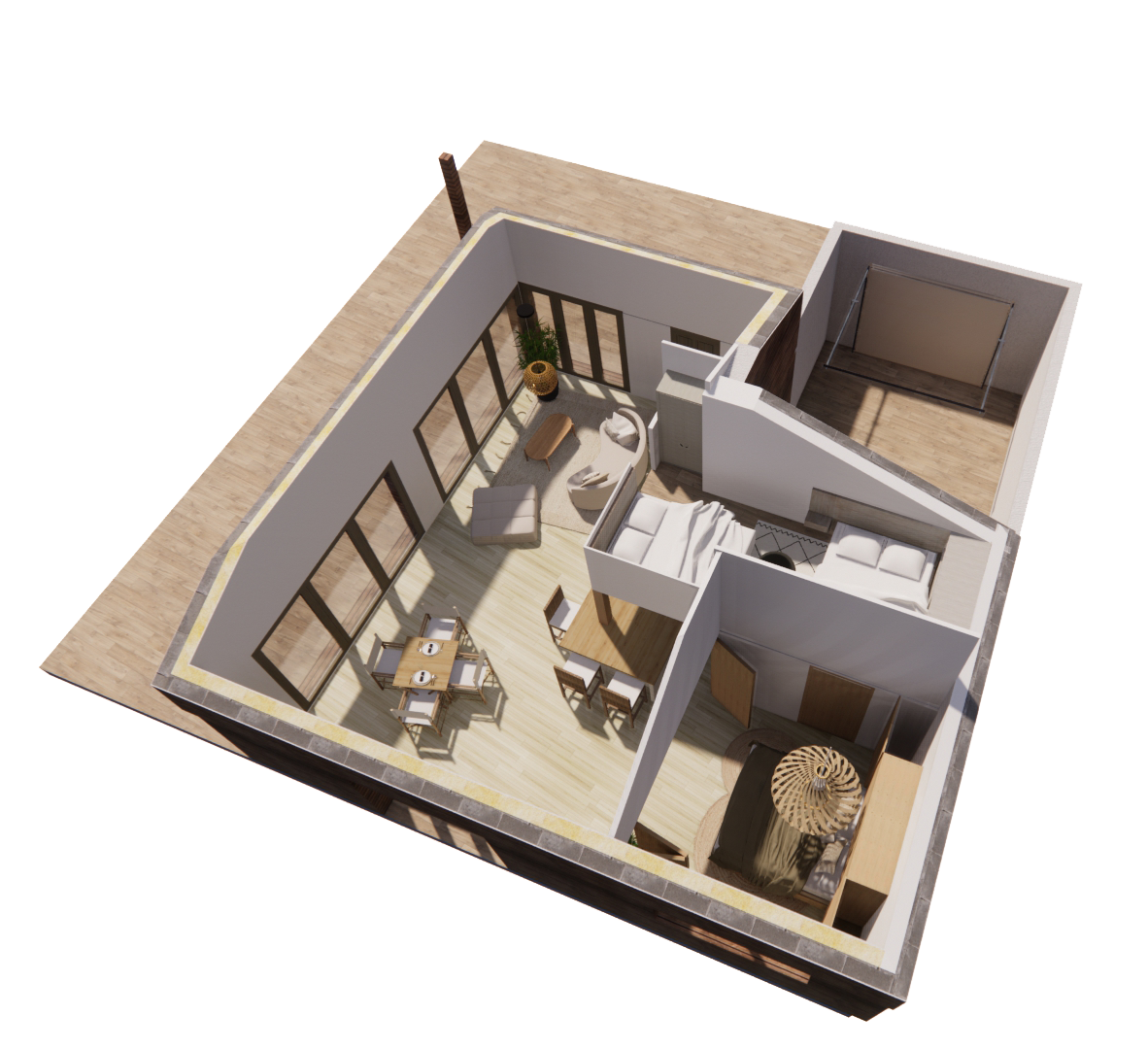 La demande des clients était de construire une maison passive d’environ 50m2 sur un terrain arboré, comprenant une chambre, un espace de vie modulable, ainsi qu’une mezzanine.