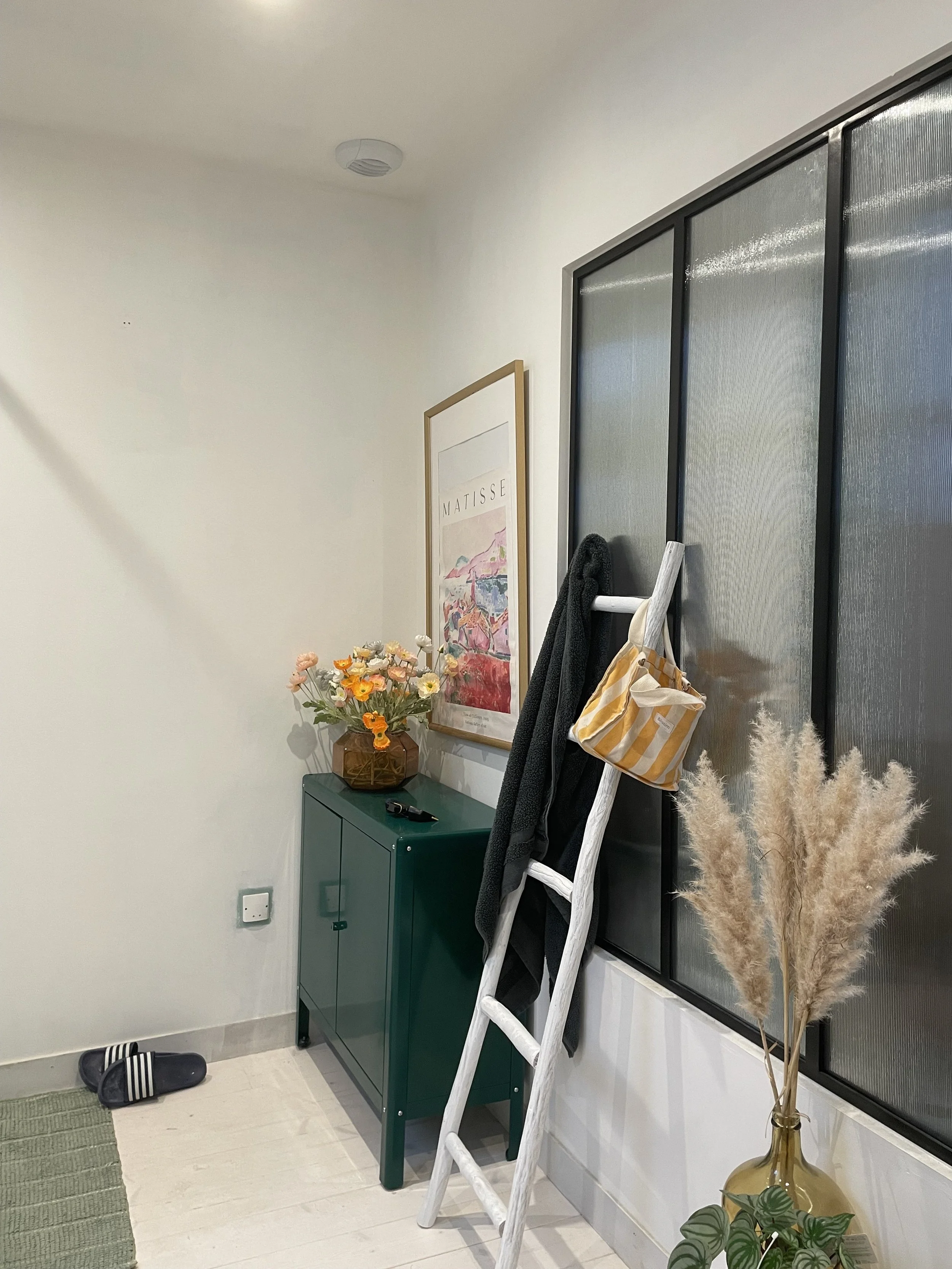 L’espace du patio à été réduis afin de créer un passage plus confortable entre la partie jour et la partie nuit et de créer un coin bureau. La verrière à été peinte en brun sombre afin d’être un élément central de la décoration. Un sol en tommette viendra terminer cet espace idéal pour les plantes.